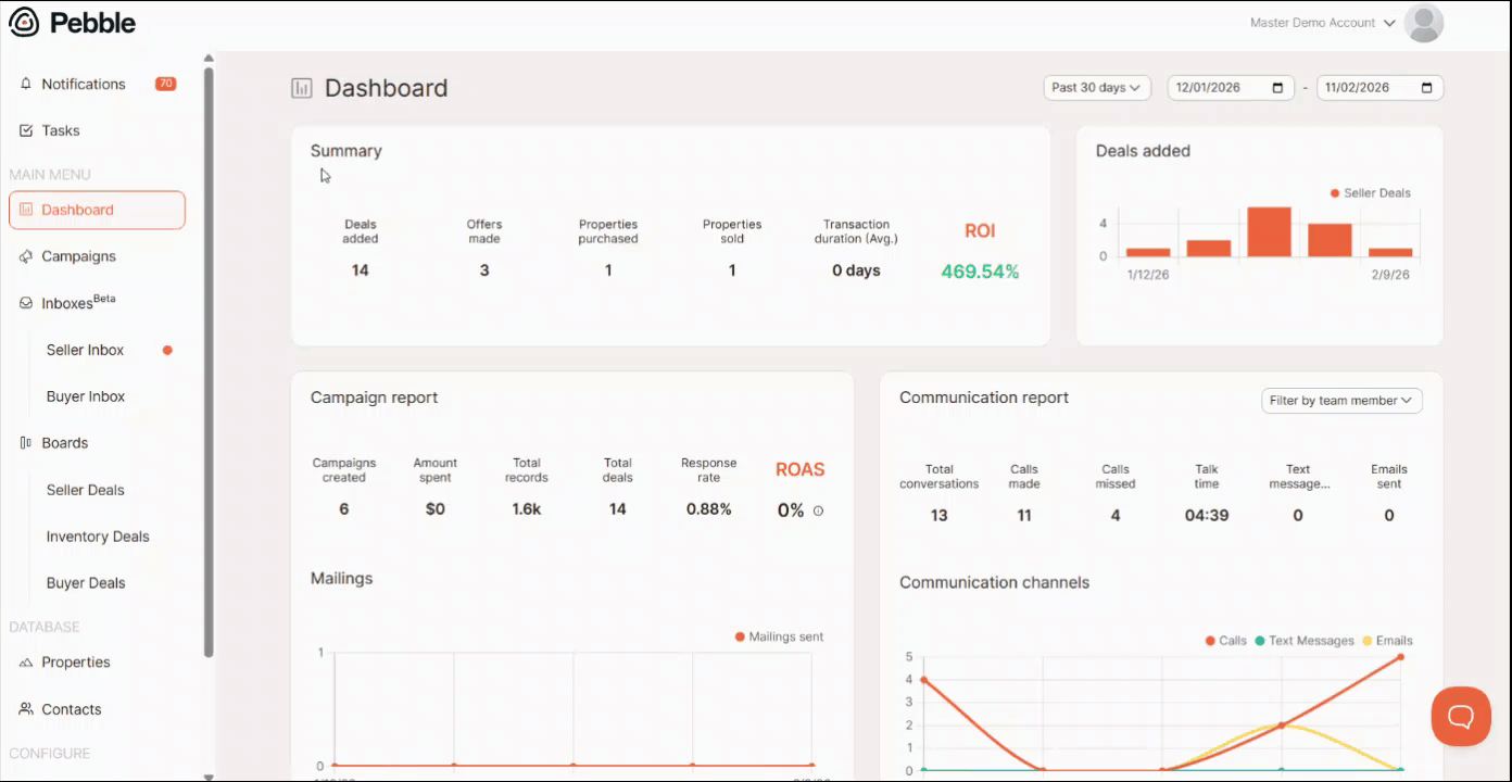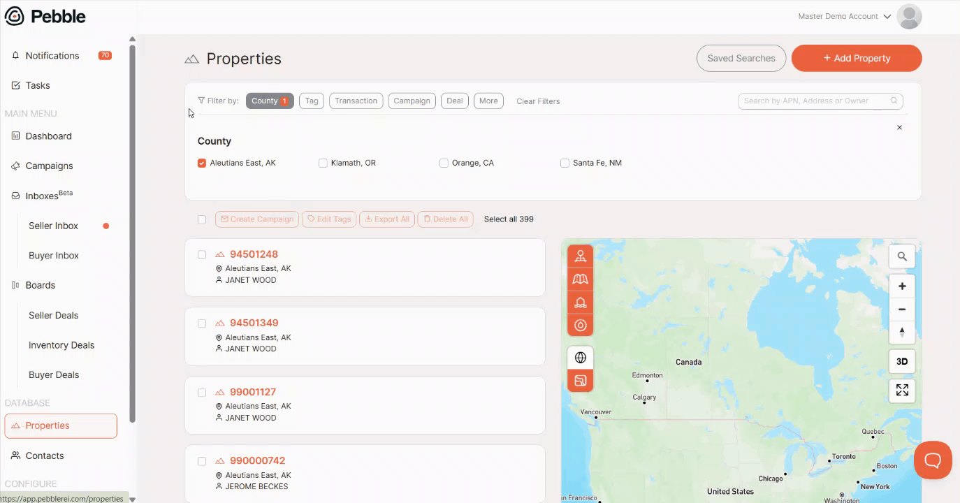 Filter the list properties you want to delete using the filter options at the top of the page. You can filter the list of properties by county, tag, field, campaign, or deal.