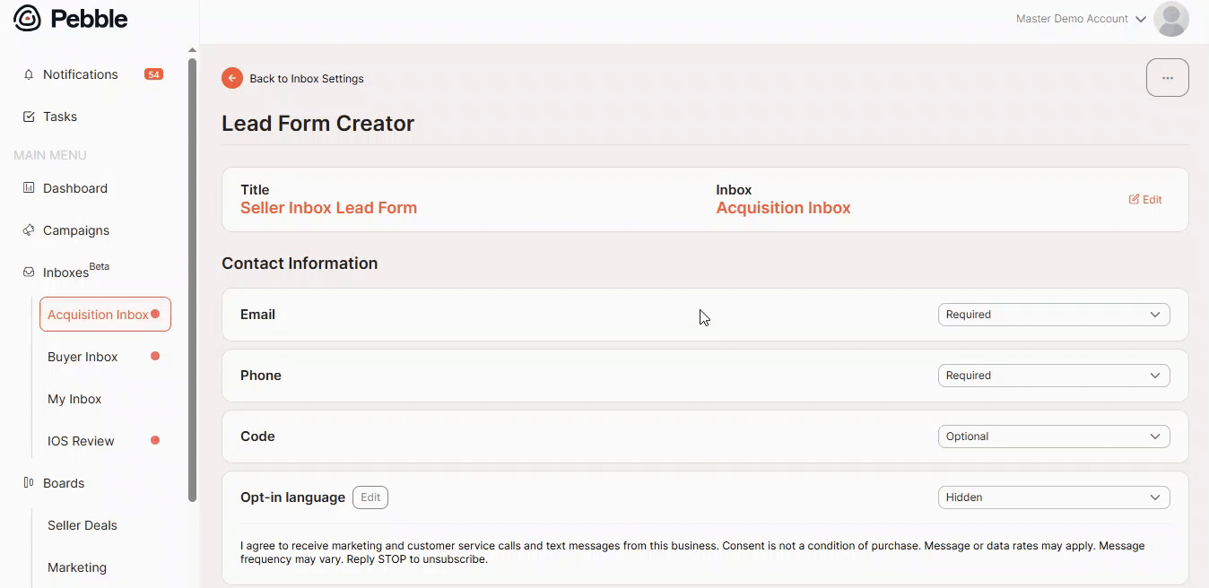 To create a lead form, log into your Pebble account and select an inbox you want the form to be connected to. Then, go to Settings. Once there, click on Add Lead Form on one of the existing inboxes. The form submission will direct the lead's information into the corresponding Inbox you have selected to create the form under.