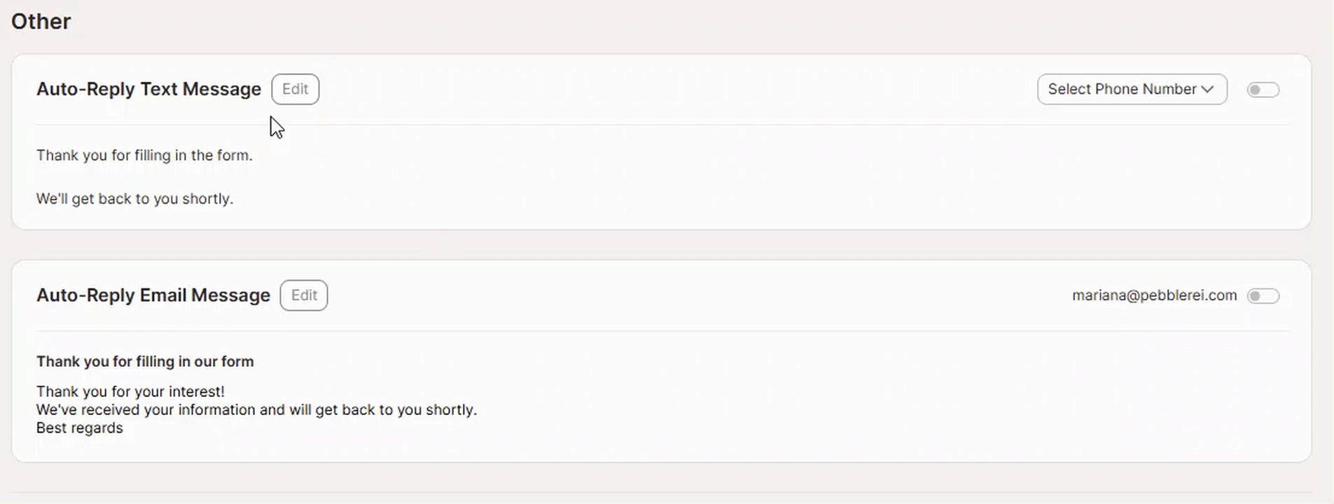 You can also set up auto-reply messages for the people that contact you using the form. They're available for text messages and emails and both of the texts are editable, you just need to click the Edit button to change them.