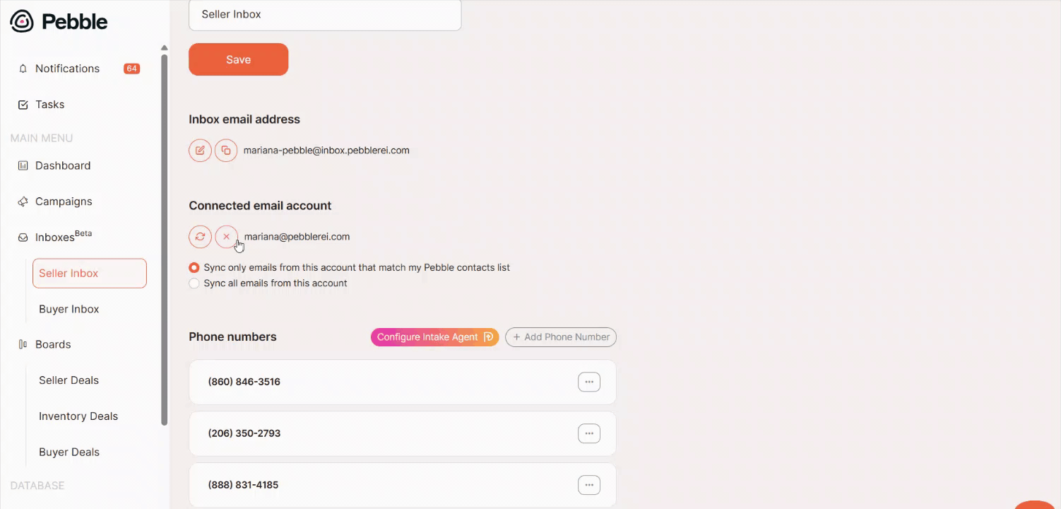 To connect your Inbox to your Pebble account, click the Inboxes on the left sidebar menu, choose the inbox you want to modify, and click the Settings (gear) icon. The Inbox Settings window will open.