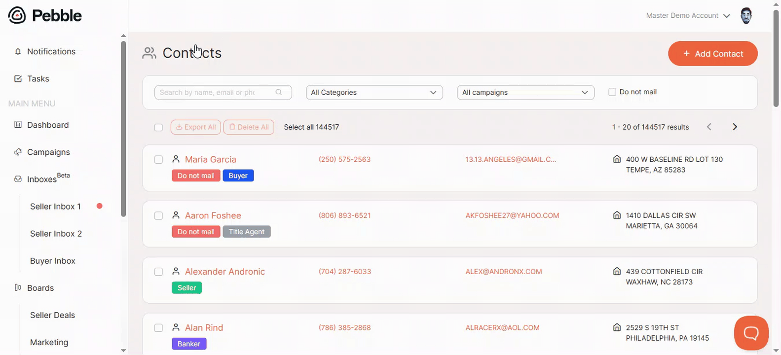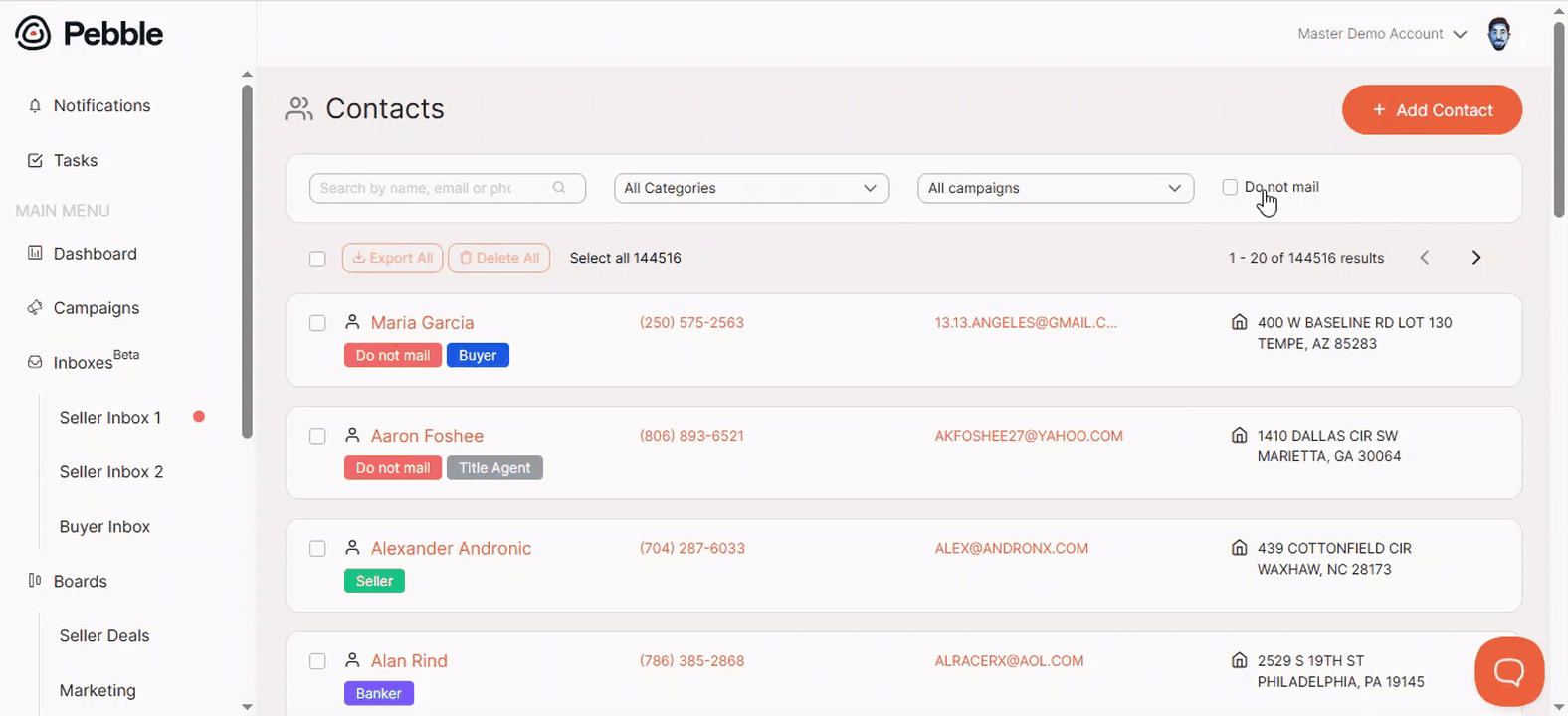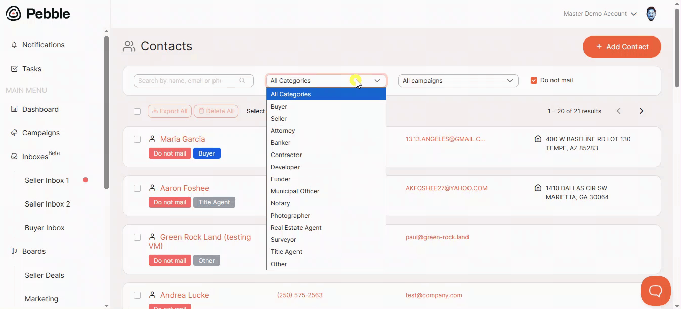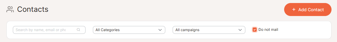 You can combine both filters simultaneously to narrow down your contact list even further. For example, you could filter for "Hot Leads" (category) who are part of your "Q1 Mailer Campaign" (campaign).
